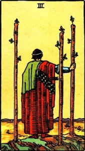 Il Tre di Bastoni nella divinazione significa l’energia manifestata, è una manifestazione dei nostri pensieri e dei nostri sforzi nel mondo del lavoro. Aspettiamo i risultati!