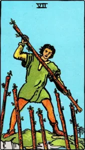 Il Sette di Bastoni indica anche la nostra capacità di capitalizzare le occasioni che si presentano nonostante le forze contrarie.