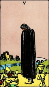 Il Cinque di Coppe nella divinazione indica una crisi interiore causata da una perdita, un senso di tristezza dovuto a un cambiamento nei sentimenti. Nulla è eterno, né la felicità né il dolore, ma la perdita di ciò a cui una persona è abituata può essere devastante.