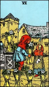 In molte circostanze, il Sei di Coppe predice uno sviluppo positivo degli eventi. È portatore di buone notizie e può indicare incontri significativi con amici d’infanzia, il risveglio del primo amore o situazioni che attingono alle radici del passato. È un segno di guarigione dalle ferite emotive, offrendo un rifugio rassicurante dopo periodi difficili e insuccessi.