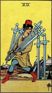 Quando appare rovesciato, il Sette di Spade suggerisce una volontà di arrendersi a causa di un’abile manipolazione. Questa posizione ribaltata mette in luce il potere degli altri di influenzare le nostre decisioni e il rischio di essere vittime di inganni o tradimenti. Potrebbe essere un avvertimento per non lasciarsi condizionare eccessivamente dagli altri e mantenere un certo grado di sospetto nei confronti delle situazioni ambigue.